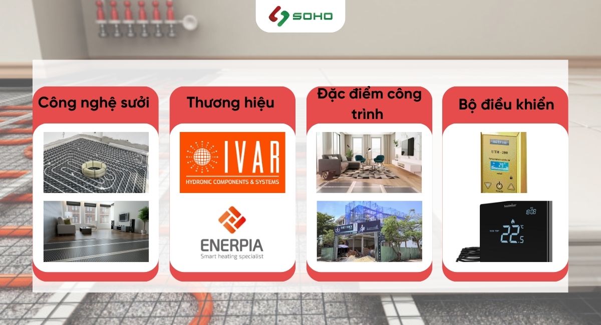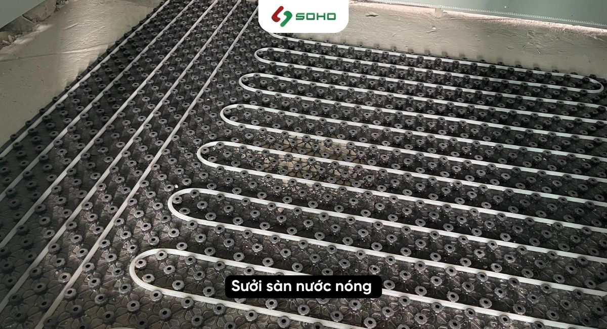 - Sử dụng ống PEX, bộ chia zone, bơm nhiệt hoặc nồi hơi.
