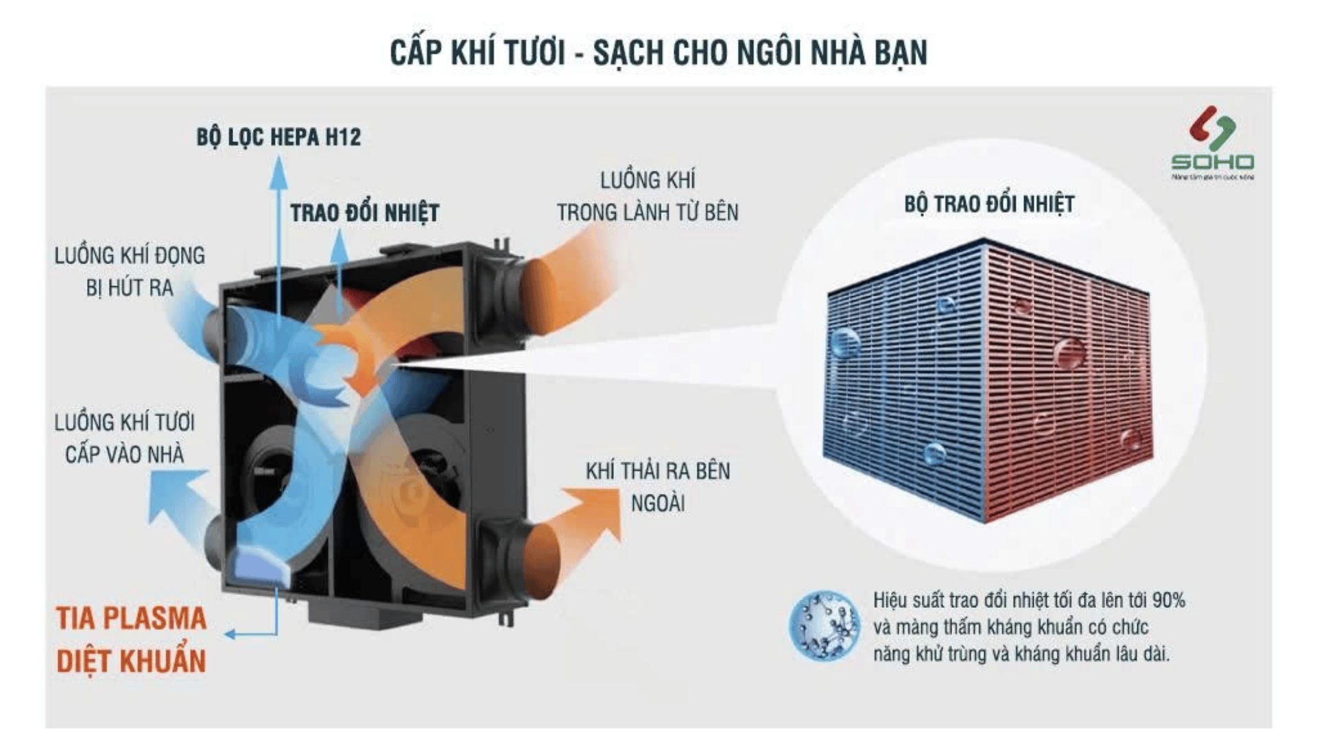 - Bộ trao đổi nhiệt: giúp cân bằng nhiệt độ giữa luồng khí trong nhà hút ra và ngoài nhà đưa vào. Giảm tiêu hao điện năng/ nhiệt năng từ điều hòa, thiết bị sưởi. Đồng thời, tạo cảm giác thoải mái, tránh luồng khí nóng/lạnh đột ngột trong phòng
