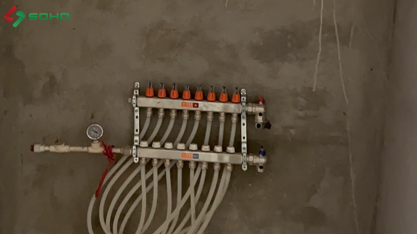 - Lắp đặt manifold phân phối nhiệt: Đặt tại vị trí kỹ thuật dễ tiếp cận, đấu nối chính xác các vòng ống, van điều chỉnh, van xả khí