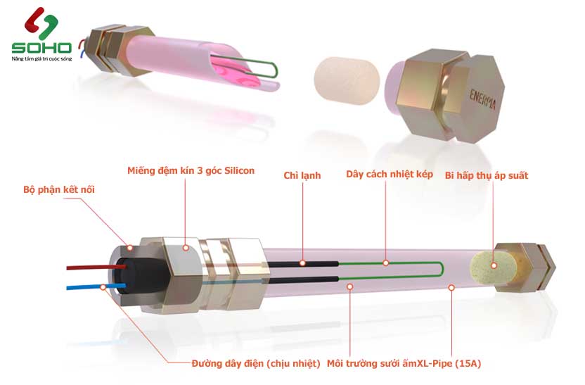 Các bộ phận liên kết với nhau chặt chẽ giúp đem lại hiệu quả lên nhiệt tối ưu. Các dây cáp bên trong được bảo vệ bằng ống nhựa chịu nhiệt tốt. Đồng thời khả năng chịu được áp lực của đường ống cũng rất cao. Đảm bảo quá trình truyền dẫn nhiệt bên trong đường ống diễn ra một cách hoàn hảo. Bên trong ống là dung dịch Bio Ceramic chứa các nguyên tố vi lượng Na, Ca, Mg,... tốt cho sức khỏe con người. Cùng với đó là lõi dây chịu nhiệt bằng Ni-Cr được phủ silicon giúp cáp lên được nhiệt độ cao nhất có thể. Đây là điểm khác biệt của cáp sưởi sàn hồng ngoại so với các dòng sưởi khác trên thị trường.