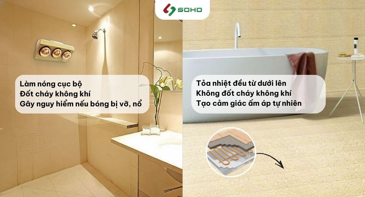 - Tác động trực tiếp vào nền gạch, nơi dễ sinh ẩm: Sưởi sàn làm ấm bề mặt sàn, giúp giảm hiện tượng đọng nước và nồm ẩm. Trong khi đó, các thiết bị như đèn sưởi hay quạt sưởi chủ yếu làm ấm không khí nên không xử lý được phần sàn lạnh.