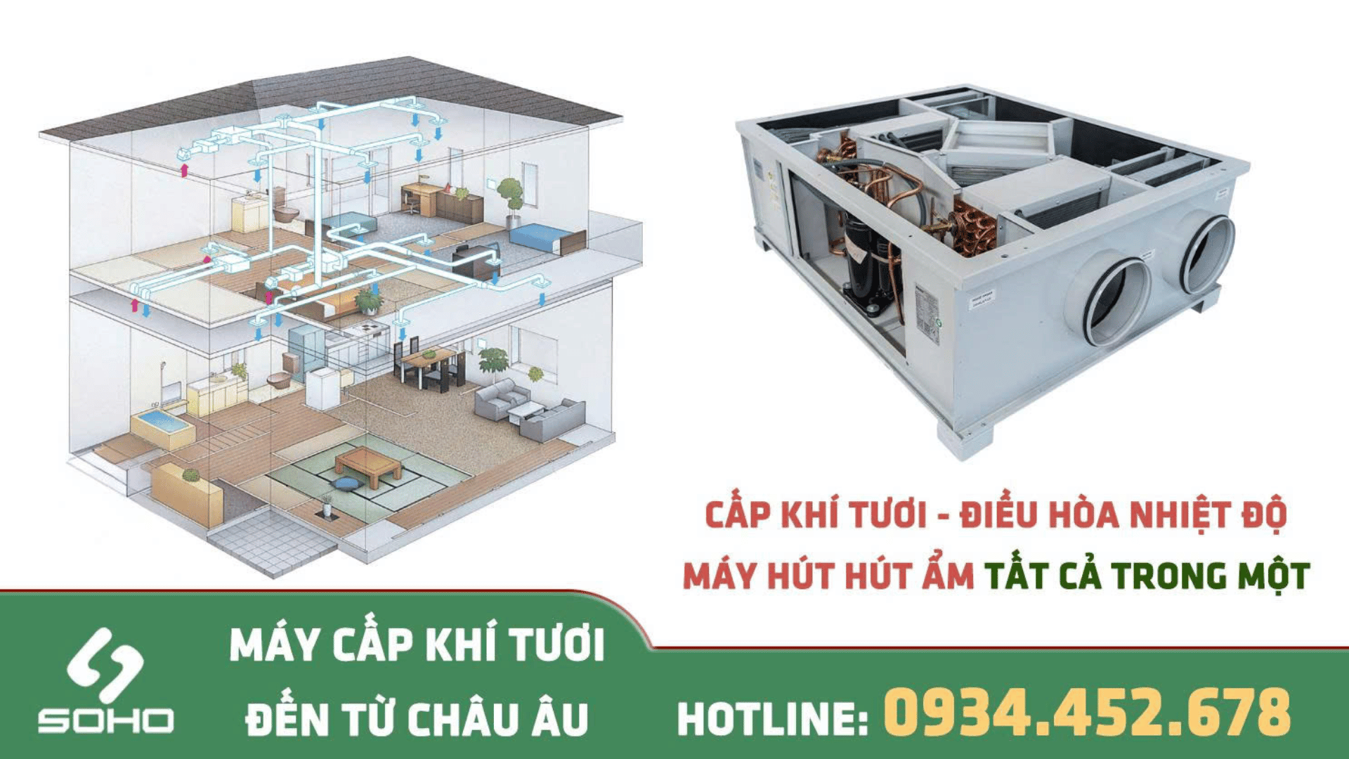 - Thiết bị: Máy cấp khí tươi thu hồi nhiệt (HRV/ERV), được đặt ở vị trí trung tâm để phân phối khí sạch đến từng tầng và từng phòng. Hệ thống này kết hợp hoàn hảo với điều hòa, có thể vừa làm mát, vừa sưởi ấm (điều hòa 2 chiều).