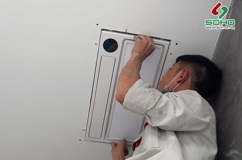 Bước 2: Đặt thân máy lên trần thạch cao. Để thâm phần chắc chắn, cố định máy với các thanh u thạch cao ở 4 góc, tránh máy bị rơi.