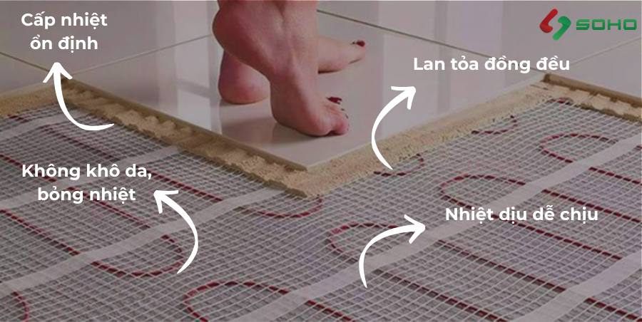 Hệ thống sưởi sàn nước nóng không có điện áp cao chạy dưới sàn, loại bỏ hoàn toàn nguy cơ chập điện hoặc rò rỉ điện. Nhiệt độ của nước luôn được kiểm soát ở mức an toàn, không gây bỏng. Đồng thời tạo ra dòng khí tốt cho sức khỏe tim mạch, xương khớp, tránh mắc bệnh về vi khuẩn hô hấp. Đặc biệt có khả năng chống ẩm ướt vào mùa nồm, khi nhiệt độ sàn cao hơn nhiệt độ không khí sẽ hạn chế hiện tượng nồm ẩm tích tụ.