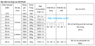 Thông số kỹ thuật của film sưởi sàn.