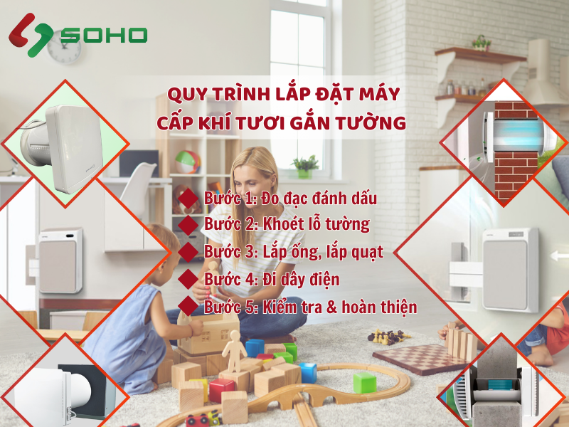 Quy trình lắp đặt máy cấp khí tươi gắn tường gồm các bước đơn giản sau đây: