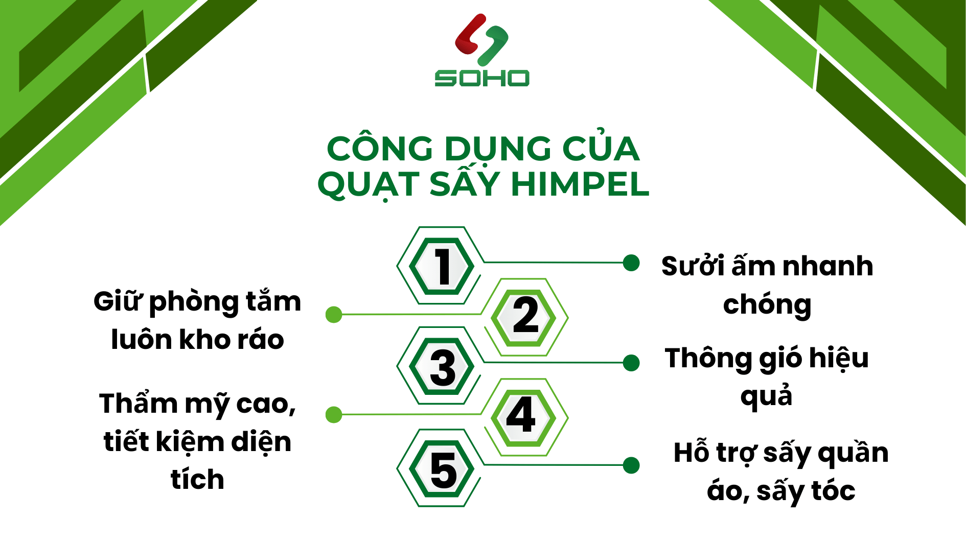 - Sưởi ấp- Thông gió - Hút mùi - Sấy khô quần áo |