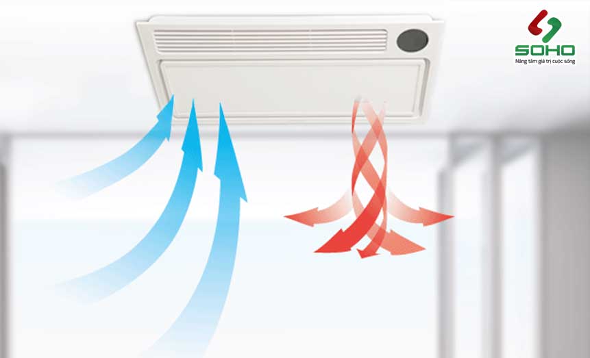 Bên cạnh khả năng sinh nhiệt, làm ấm không khí vào mùa đông. Vào mùa hè, hoàn toàn có thể bật chức năng quạt gió để làm mát. Chúng thổi gió và lấy khí tuần hoàn trong phòng. Trên mặt quạt có tấm cắt gió để ngăn gió không thổi trực tiếp vào cơ thể người. Hoạt động giống như 1 chiếc quạt trần trong nhà.