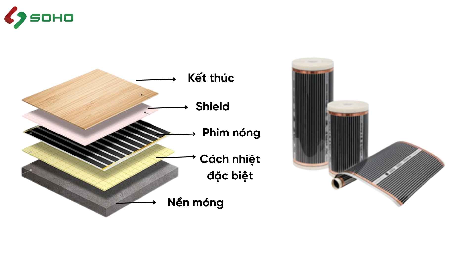 Film sưởi sàn là một loại tấm sưởi mỏng được bức xạ nhiệt bằng những sóng hồng ngoại dài làm bằng phân tử carbon nhiệt, các dải carbon được tráng mỏng bằng lớp carbon hoạt tính. Để giúp chống bụi bẩn và ẩm mốc, dải carbon kết nối với thanh điện cực tích điện đồng và được ép bằng film PET nhiều lớp.