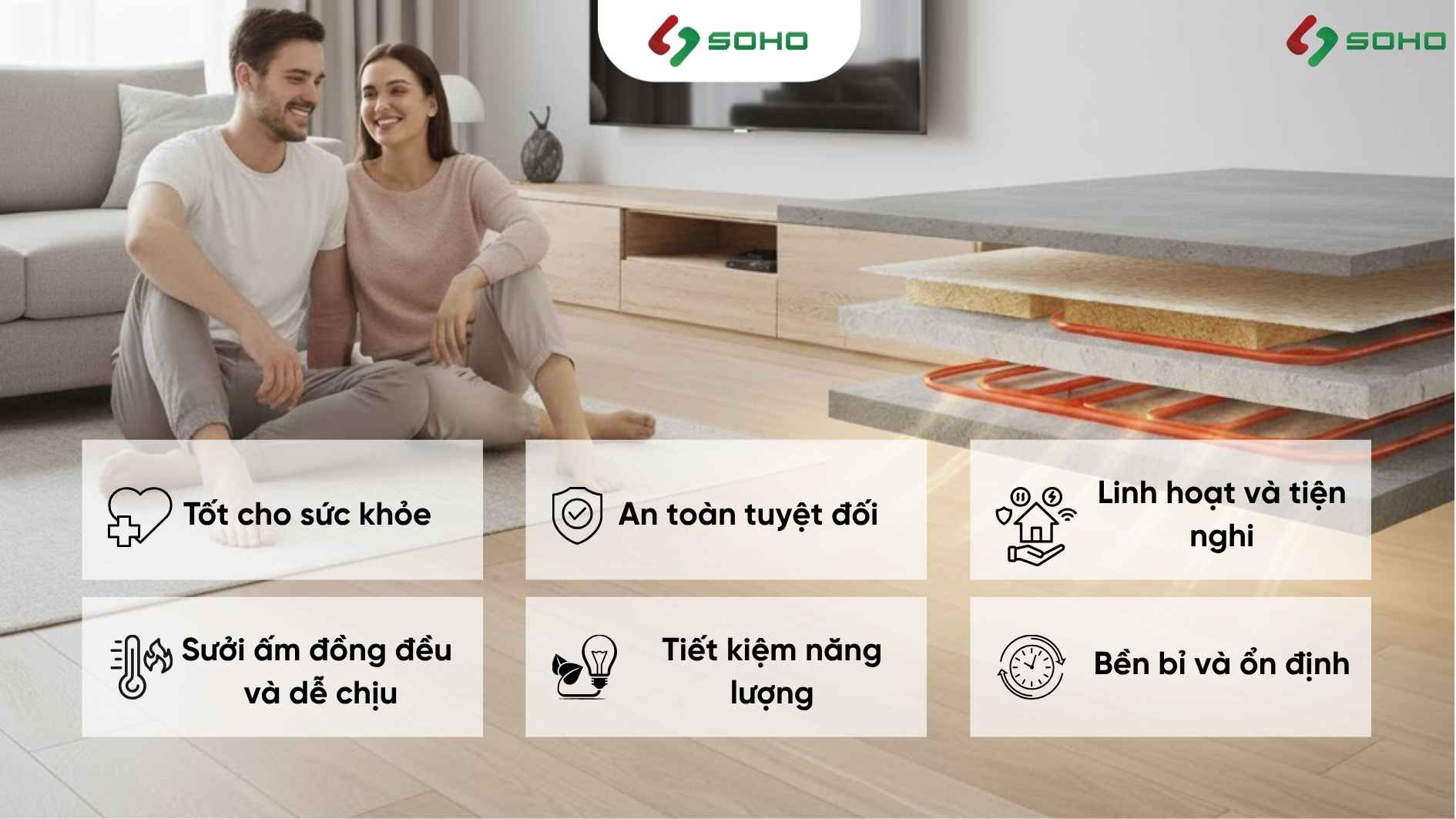 Hệ thống này có thể sử dụng nguồn nhiệt trực tiếp từ điện hoặc gián tiếp từ nước nóng. Khi hoạt động, toàn bộ mặt sàn trở thành “tấm phát nhiệt khổng lồ”, giúp không khí ấm dần từ dưới lên, đảm bảo người sử dụng luôn cảm thấy dễ chịu, không bị khô da, không ngột ngạt.