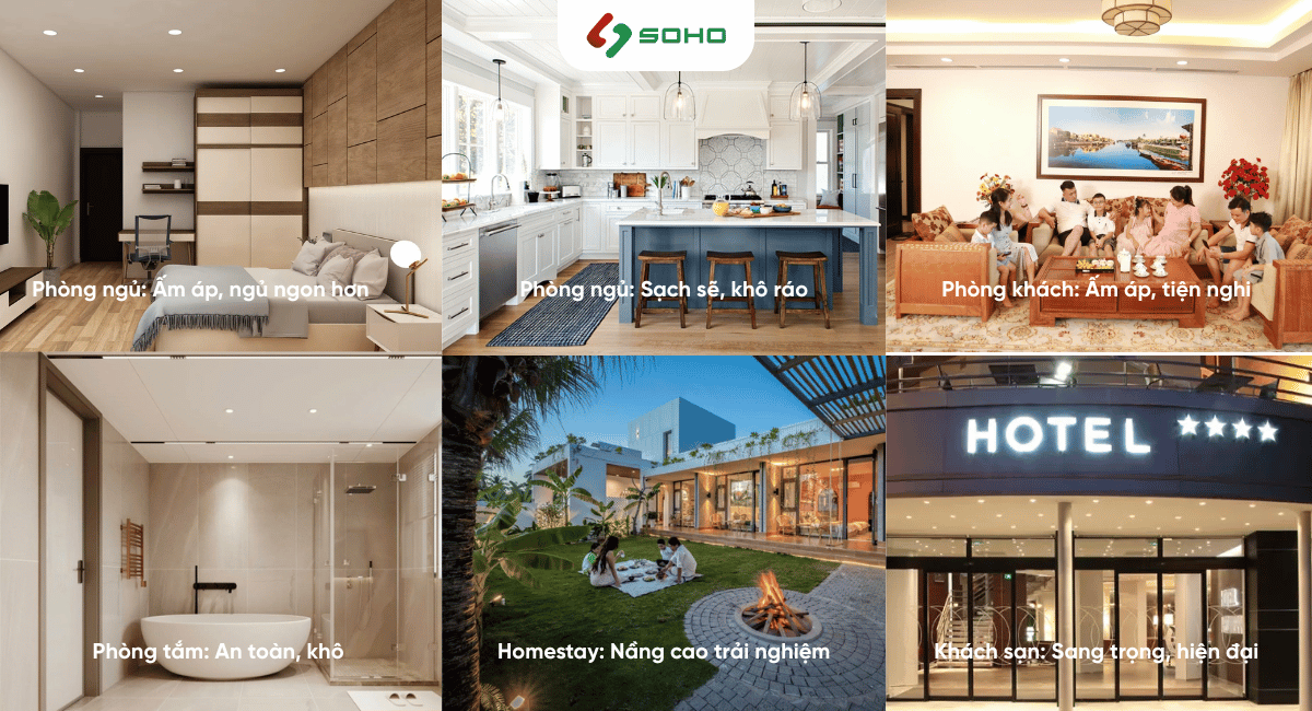 - Homestay, resort, khách sạn, trung tâm thương mại: Đối với các công trình lưu trú, sưởi sàn trở thành yếu tố nâng cấp trải nghiệm khách hàng. Phòng nghỉ luôn ấm áp, đồng đều, tạo ấn tượng sang trọng và tiện nghi. Đây là điểm khác biệt cạnh tranh so với các nơi chỉ sử dụng điều hòa hoặc máy sưởi truyền thống, giúp khách hàng hài lòng và quay trở lại nhiều lần.