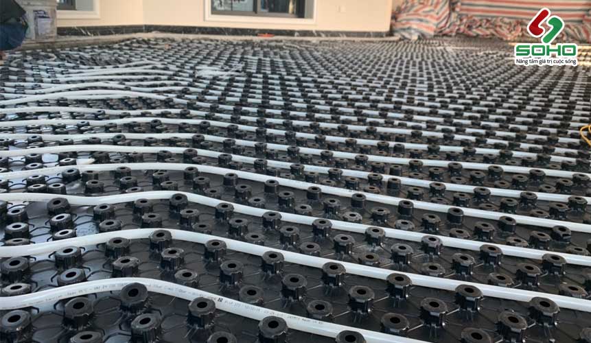 | Tấm lót cách nhiệt và cố định cáp | Bên dưới tấm lót cách nhiệt được bố trí sẵn 1 lớp keo mỏng giúp dễ dàng cố định chúng xuống nền nhà mà không cần thêm các thiết bị hỗ trợ khác. Trên bề mặt được chia thành các ô khác nhau để dễ dàng cố định ống sưởi xuống sàn nhà. Độ dày của cả tấm là 22mm. Tấm lót này được làm bằng nhựa có khả năng chịu nhiệt và cách nhiệt rất tốt |