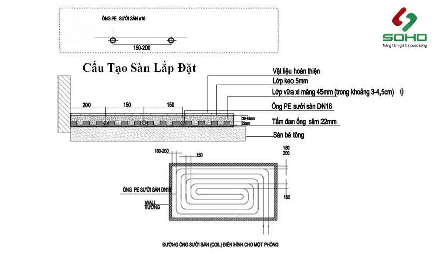 Sàn lắp đặt cáp gồm các phần: Sàn bê tông, tấm lót cách nhiệt, ống nước ivar, vữa xi măng và sàn hoàn thiện. Sau khi thi công thường sẽ nâng cốt sàn lên 4.5-5 cm nên đặc biệt lưu ý khi lực chọn dòng thiết bị này để lắp đặt cho không gian của mình. Với những công trình có độ cao thấp thì nên cân nhắc trước khi lựa chọn.