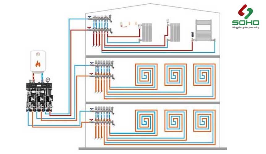 Máy bơm nhiệt sẽ có nhiệm vụ làm nóng nước, truyền vào bình chứa nước. Bình chứa nước này sẽ cung cấp nước đến Multimix-bộ chia nước nóng trung tâm. Chúng sẽ chia nước nóng đến các zone khác nhau để dẫn đến Mainfold của các tầng, các khu vực khác nhau. Tại đây Mainfold sẽ chia nước nóng đến đường ống nước đã được cố định sẵn dưới sàn ở các phòng khác nhau để làm ấm sàn nhà. Mỗi mainfold, multimix, bình chứa nước và máy bơm nhiệt đều có 1 đường cấp-hút song song để cung với quá trình cấp nước nóng vào đường ống, dòng nước sẽ được luân chuyển trở lại 1 cách liên tục để đảm bảo nhiệt trong ống sưởi luôn đều và ổn định. Quá trình cấp, hút nước diễn ra đều và liên tục khiến không khí trong phòng luôn ấm áp mà không bị mất nhiệt.