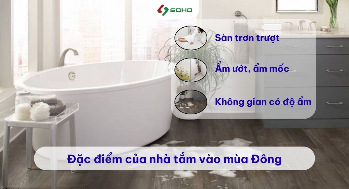 Phòng tắm là không gian có độ ẩm cao nhất trong nhà do thường xuyên tiếp xúc với nước nóng – lạnh. Khi nhiệt độ môi trường giảm vào mùa đông, hơi nước dễ ngưng tụ trên bề mặt sàn và tường, khiến nền nhà luôn trong trạng thái ẩm ướt. Việc thông gió tự nhiên kém càng làm tình trạng này trở nên trầm trọng, gây cảm giác lạnh và khó chịu khi sử dụng.