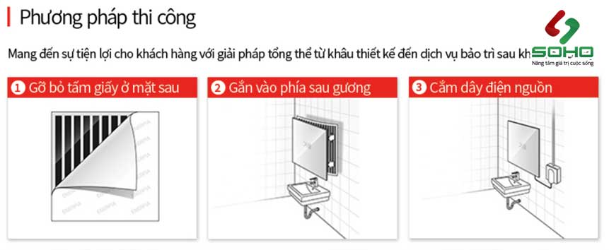 Điện năng từ nguồn điện sẽ chuyển hóa thành nhiệt năng, làm ấm film sưởi sau đó là lớp vật liệu phía trên nó và không gian xung quanh. Hơi ấm tỏa ra từ film sẽ làm tan lớp sương quanh kính, với các lớp sương và nước đọng vào kính cũng nhanh chóng được làm khô. Trả lại bề mặt gương sáng, sạch, không bị mờ.