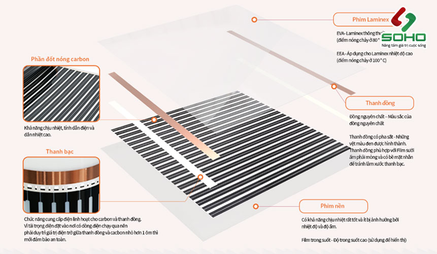 Một tấm film sưởi gồm 5 bộ phận chính