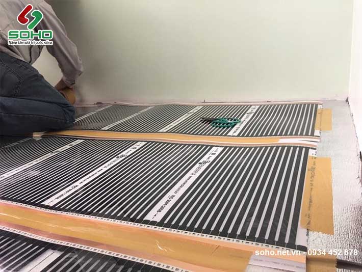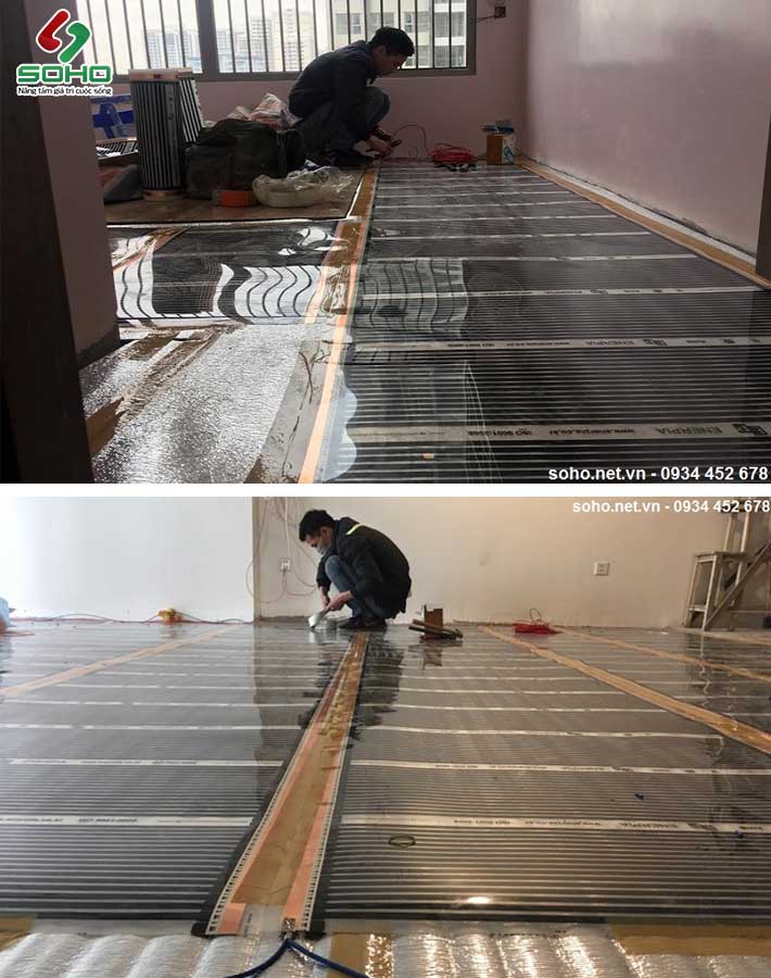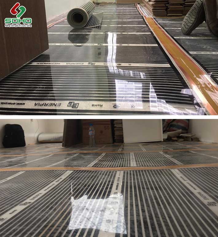 Với điều kiện công trình gần như đã hoàn thiện phần thô. Nên việc lắp đặt các loại cáp sưởi sẽ gặp nhiều khó khăn và gây ảnh hưởng đến cốt nền cũng như độ cao của nhà. Dưới sự tư vấn của đội ngũ kỹ thuật và mức đầu tư của gia đình. Soho đã lựa chọn film sưởi để lắp đặt cho toàn bộ sàn nhà nhà Mạnh.