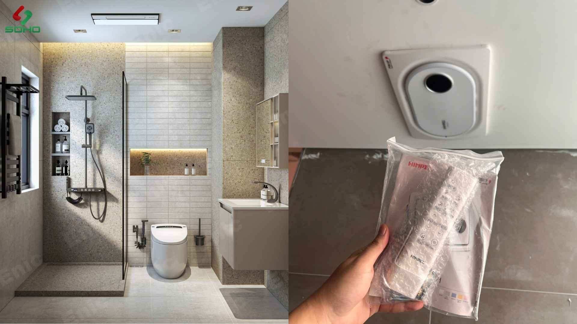 - Hút ẩm mạnh mẽ: Không chỉ là thông gió đơn thuần, chức năng hút ẩm chuyên sâu giúp kiểm soát độ ẩm sau khi tắm, loại bỏ hơi nước dư thừa nhanh chóng. Điều này ngăn ngừa nấm mốc phát triển, bảo vệ nội thất và duy trì không gian khô thoáng, sạch khuẩn trong những ngày nồm ẩm.