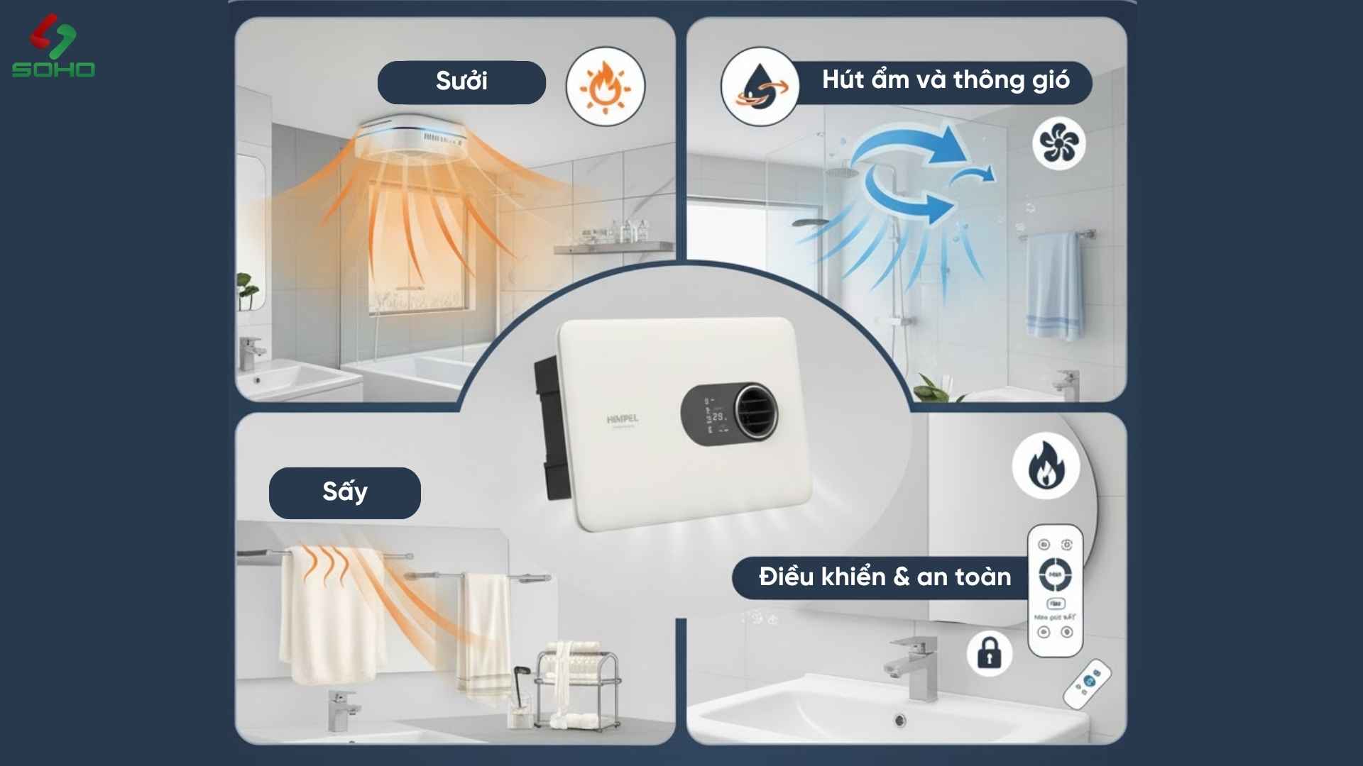Trong môi trường khí hậu đặc thù của Việt Nam (lạnh và nồm ẩm), một chiếc quạt sưởi âm trần lý tưởng phải là một giải pháp khí hậu tích hợp, không chỉ đơn thuần là sưởi ấm. Các model cao cấp thường cung cấp giải pháp 4-in-1 đáp ứng toàn diện nhu cầu sinh hoạt và bảo vệ không gian: