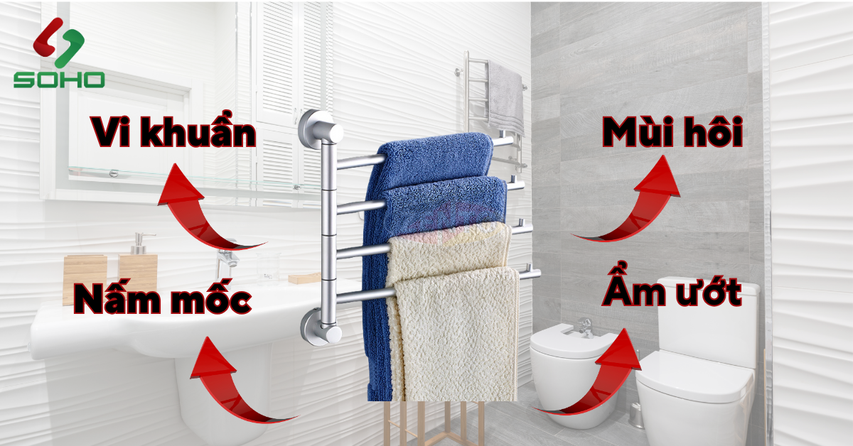 Khăn tắm sau khi sử dụng thường bị ẩm và treo trong phòng tắm bí hơi, tạo điều kiện cho vi khuẩn, nấm mốc phát triển, gây ra mùi hôi khó chịu và các bệnh về da. Bằng cách sử dụng thang sấy khăn, bạn có thể loại bỏ hoàn toàn mối lo này.